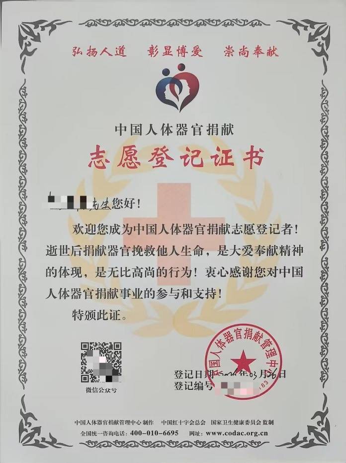 器官登记捐赠证书